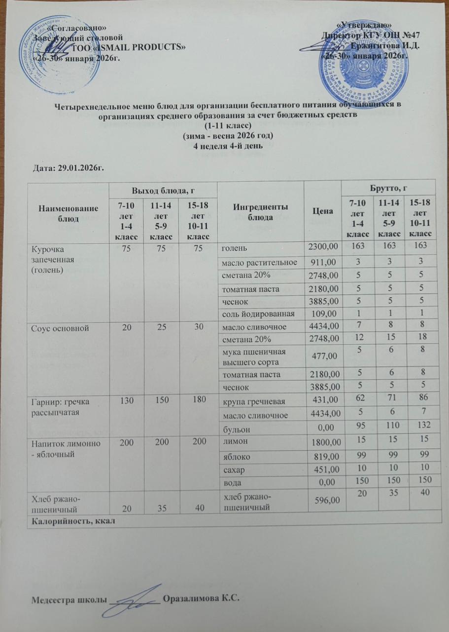 Бюджет қаражаты есебінен орта білім беру ұйымдарында білім алушыларды тегін тамақтандыруды ұйымдастыру үшін төрт апталық ас мәзірі/ Четырехнедельное меню блюд для организации бесплатного питания обучающихся в организациях среднего образования за счет бюджетных средств