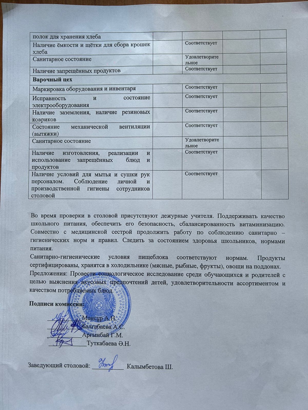 » Мектеп асханасын мониторингтік комиссияның тексеру нәтижелері